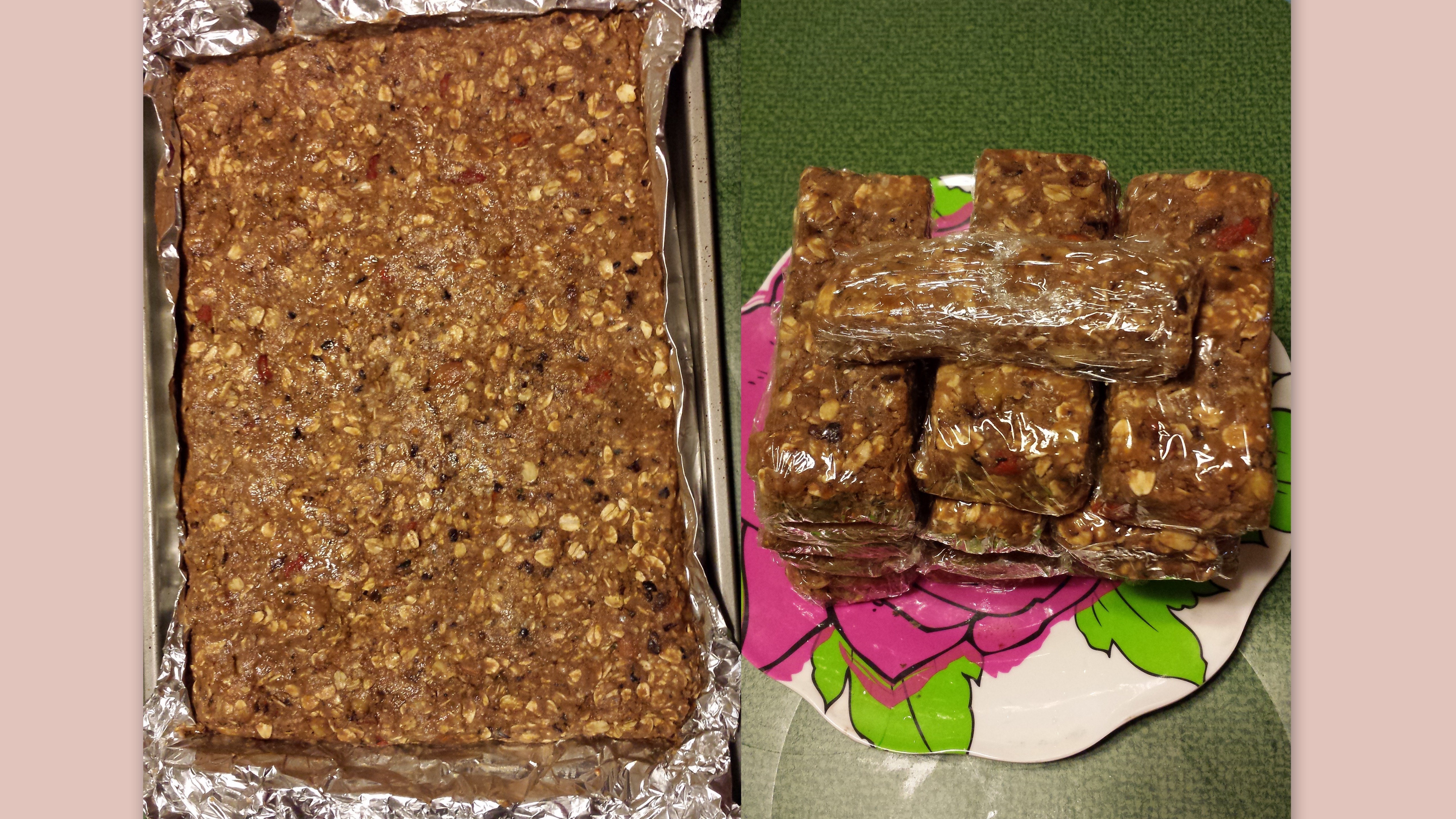 To make flax meal at home, just dry roast flax seeds and grind them to a fine powder and store in a air tight jar.Mix all ingredients in a stand mixer/food processor or in large bowl. Place a aluminum foil/parchment paper on a flattened dish and spray some olive oil and wipe it off with a kitchen paper. Now place the dough and flatten the mix by using the back of the spoon. Chill overnight or minimum 2 hrs and cut into 12 to 16 bars and pack them in cling wrap as shown in the picture. Store at room temperature or in the lower bottom in the refrigerator. Consume within 2 weeks.
