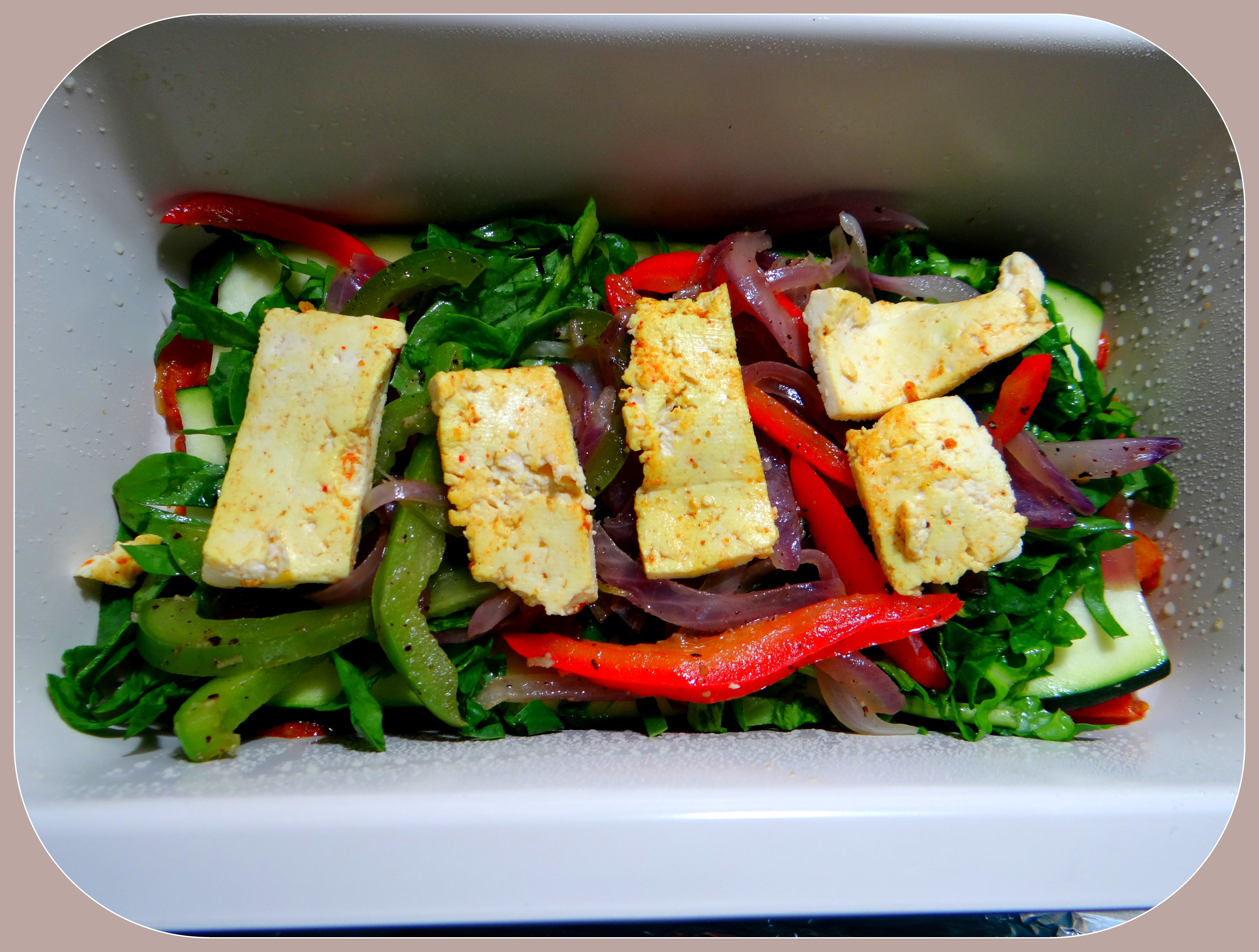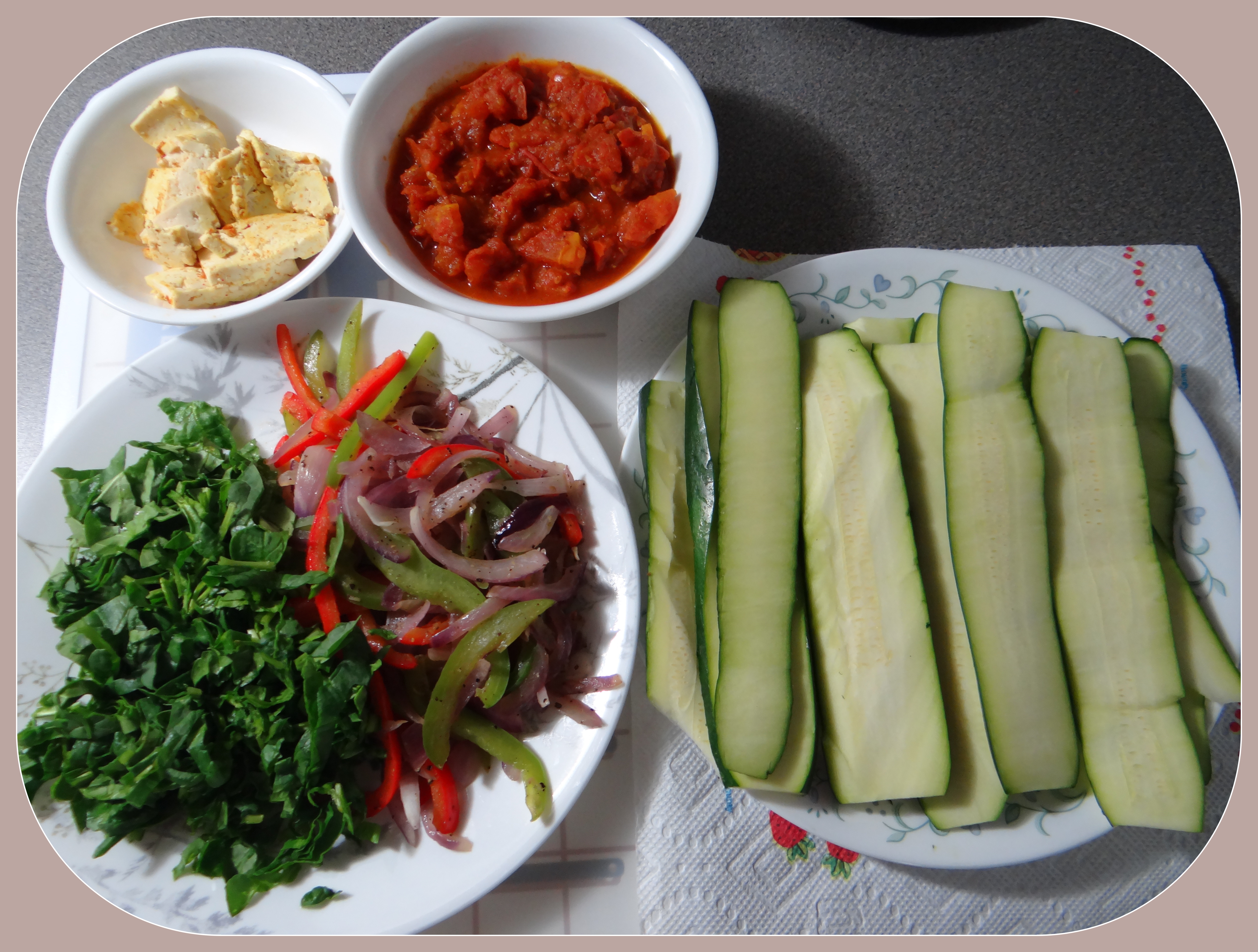 - Spread some sauce on the zucchini slices & top it up with stir fry veggies, tofu slices and cheese.