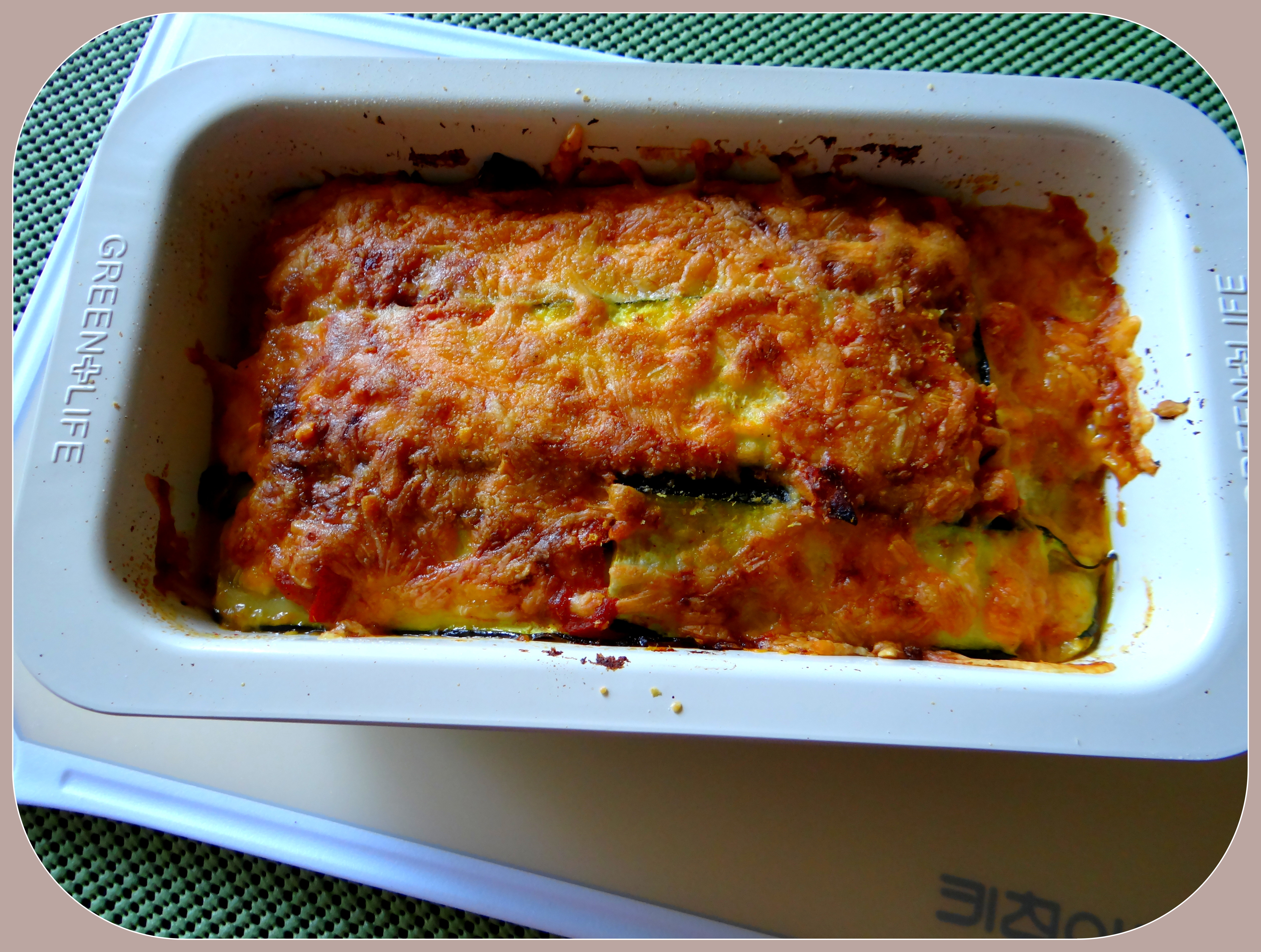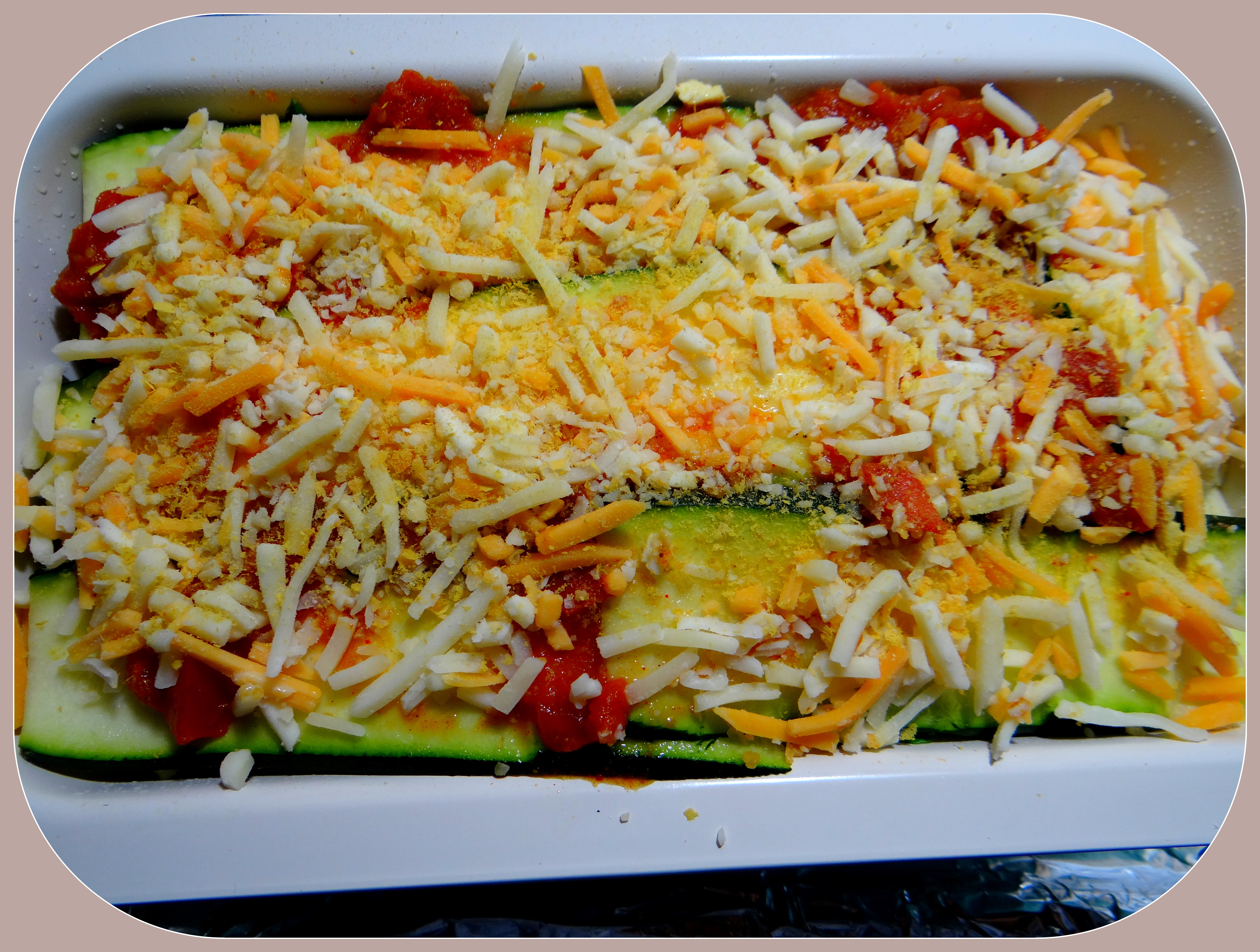 - Layer 3 to 4 zucchini slices to cover the sauce.
