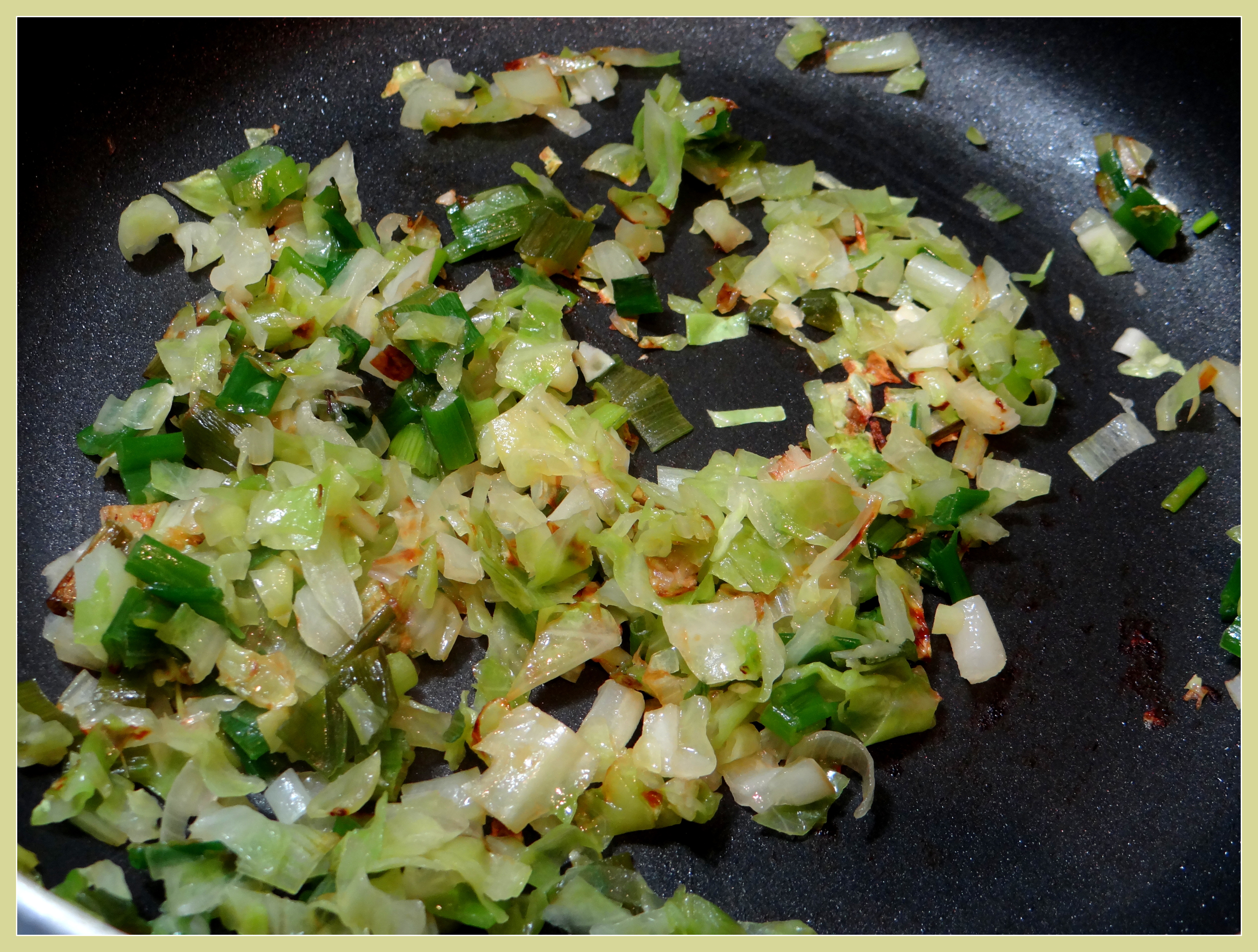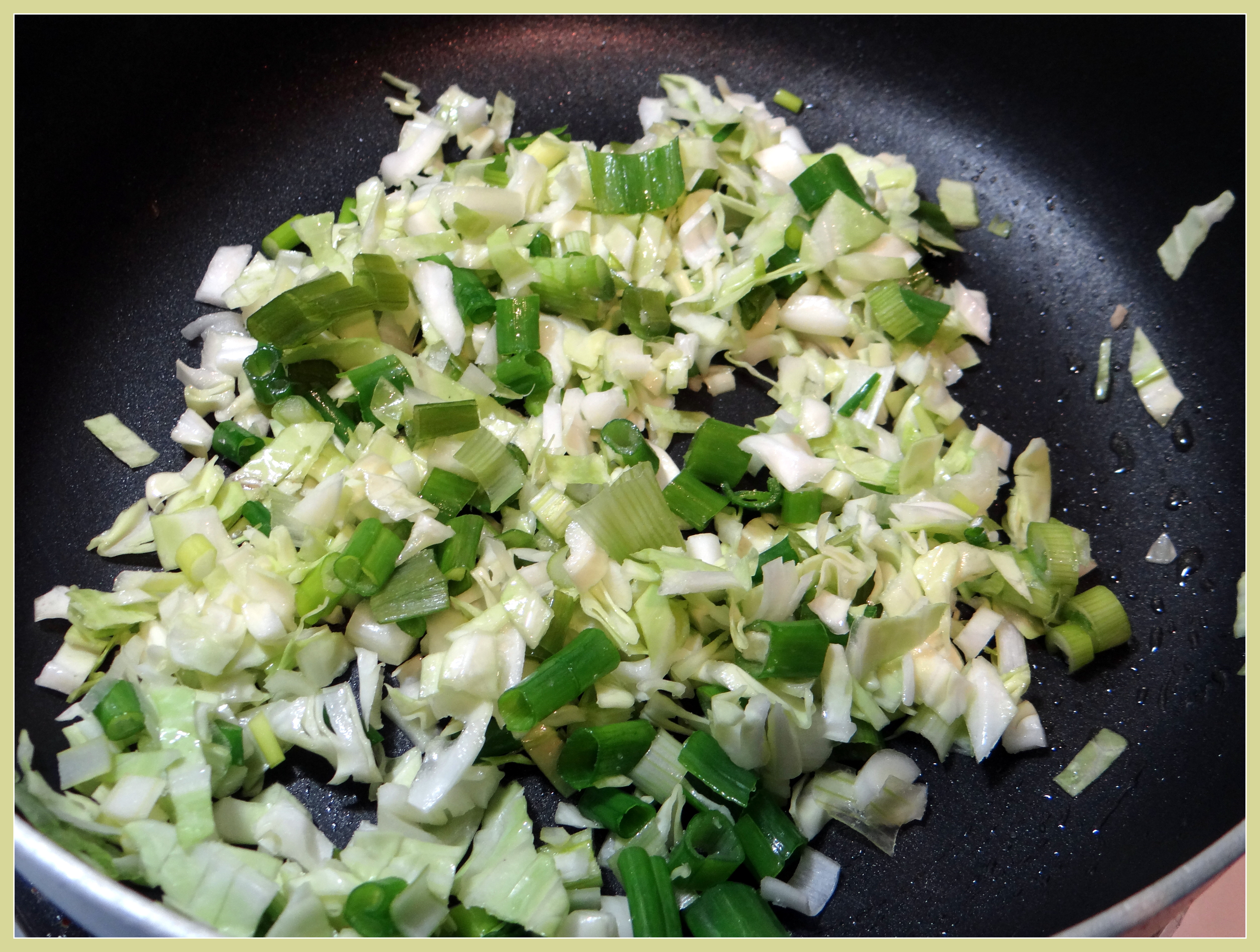 3. In a deep bottom saucepan add 1 teaspoon of olive oil. When the oil is hot, add in the chopped spring onions and chopped cabbage. Sprinkle some salt and saute/stir until the onions and cabbage turn a little soft. You can keep the saucepan partially covered so the steam that is generated inside helps the onions and cabbage to cook faster.