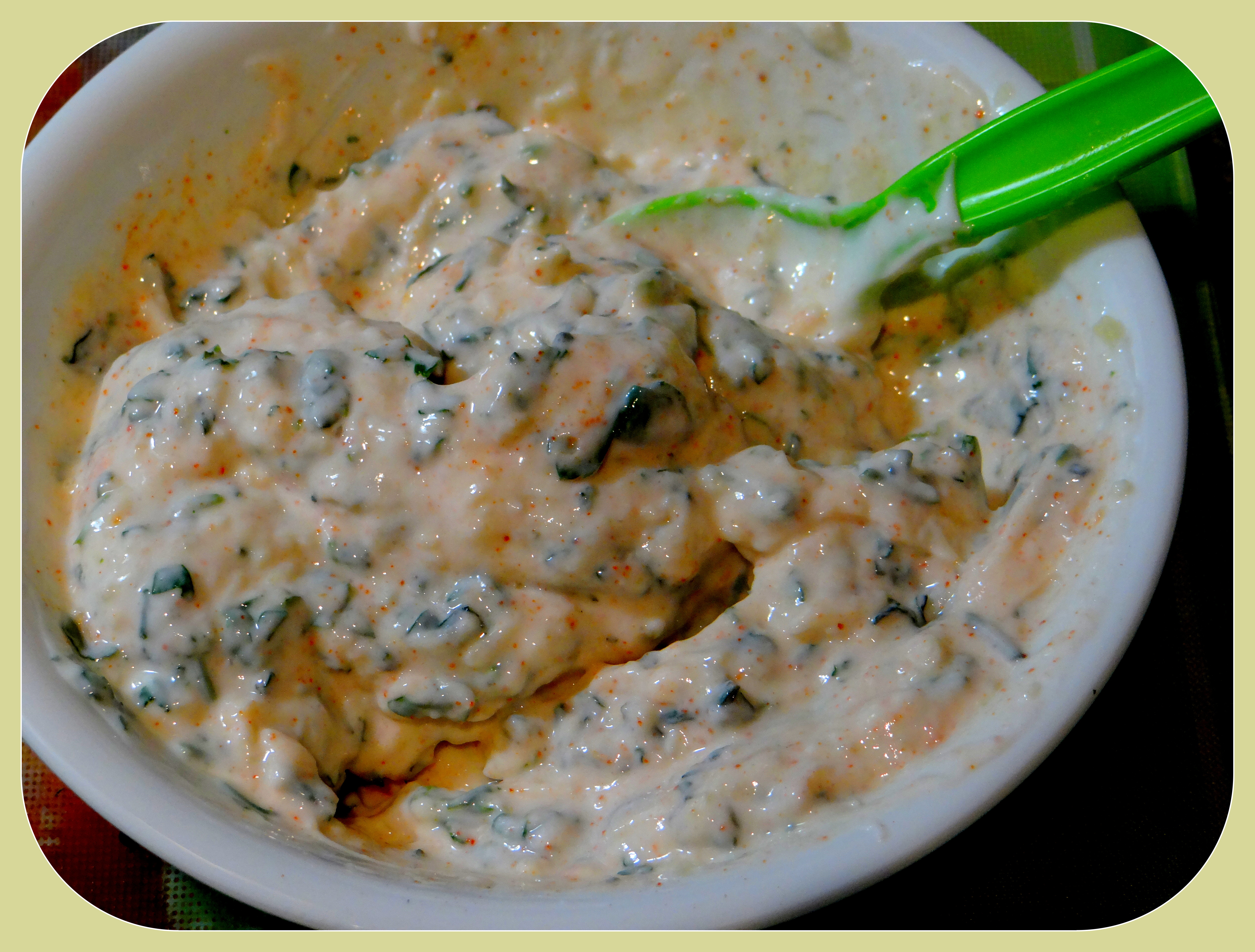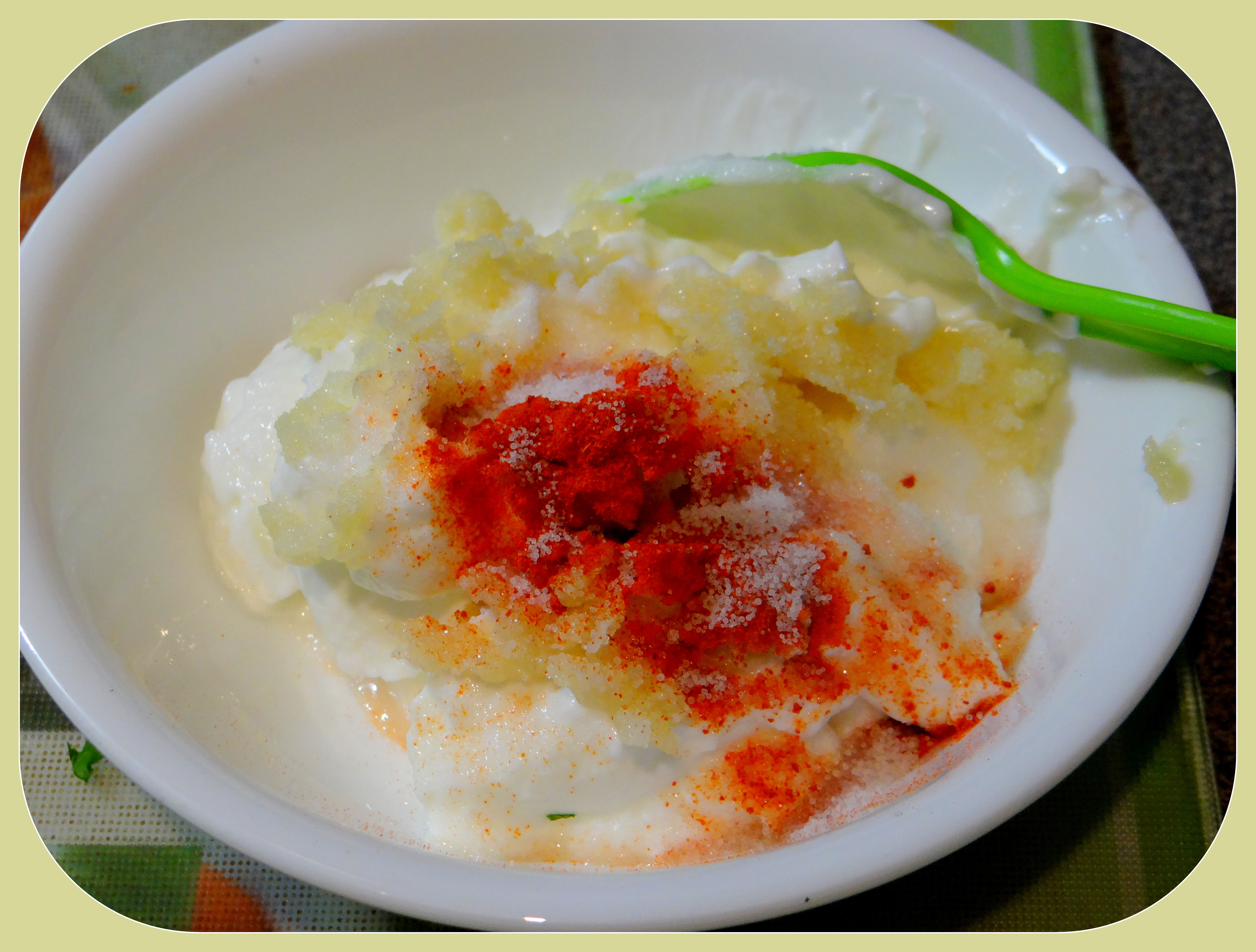 1.To make the yogurt spread : In a bowl add the yogurt, paprika powder, grated garlic, salt, chopped parsley and mix well. Keep aside.