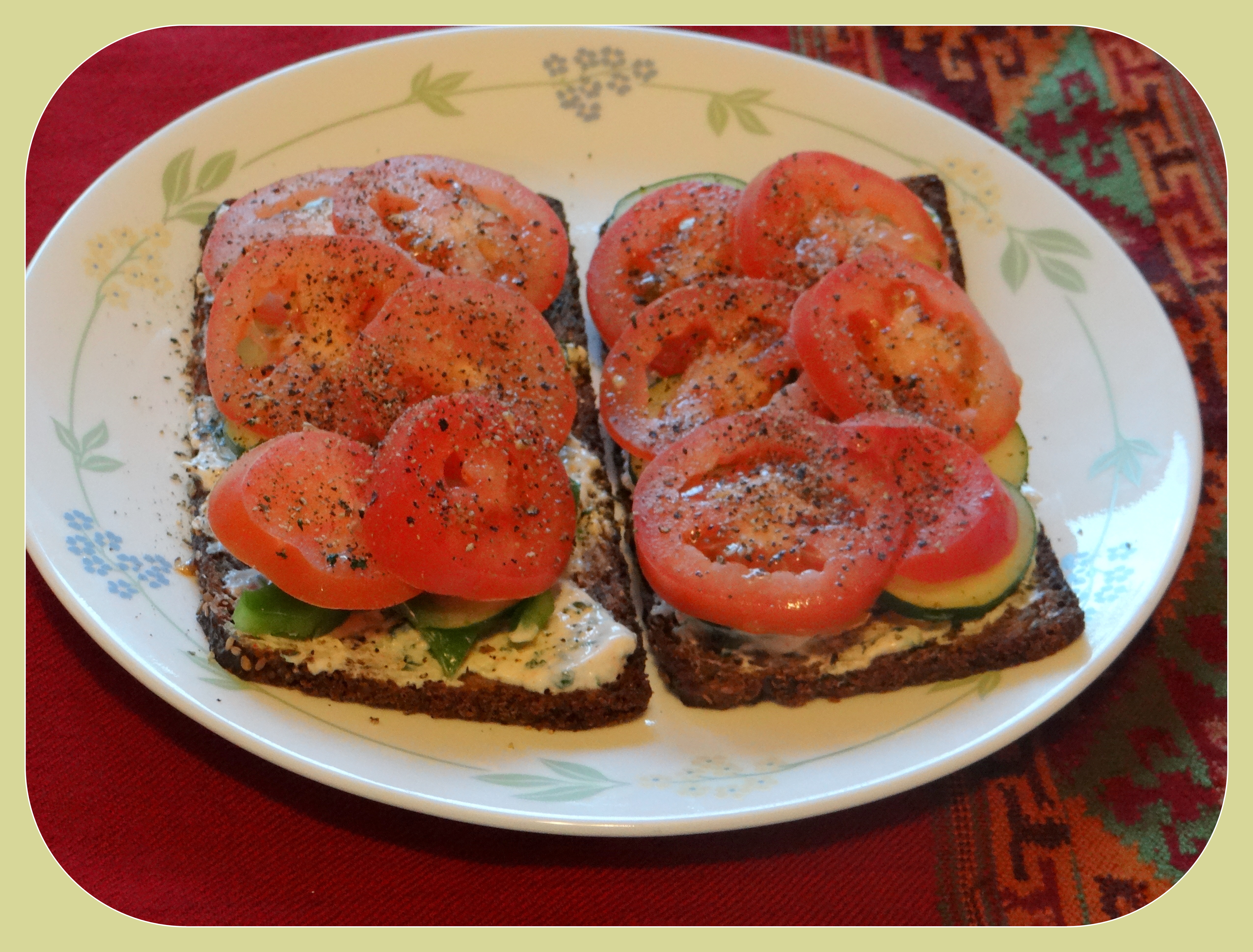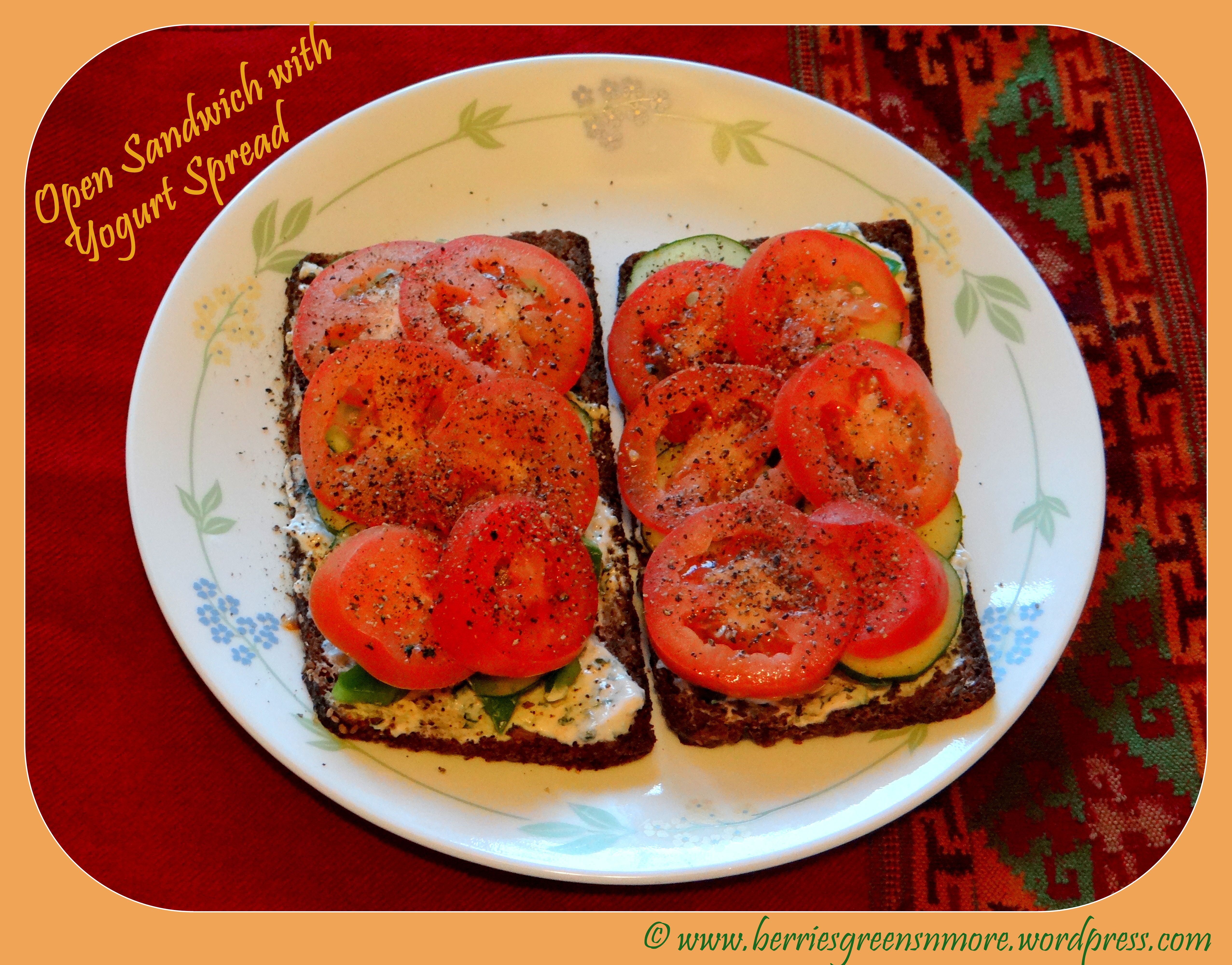 Healthy whole grain sprouted bread (rye, moong sprouts, flax seeds & oat fiber) topped with yummy homemade creamy yogurt spread and vegetables serves as an excellent meal at anytime of the day. Yogurt has good probiotics known as the good or helpful bacteria which help to keep your gut / digestive system healthy. Satisfy your taste buds with these healthy sandwiches.