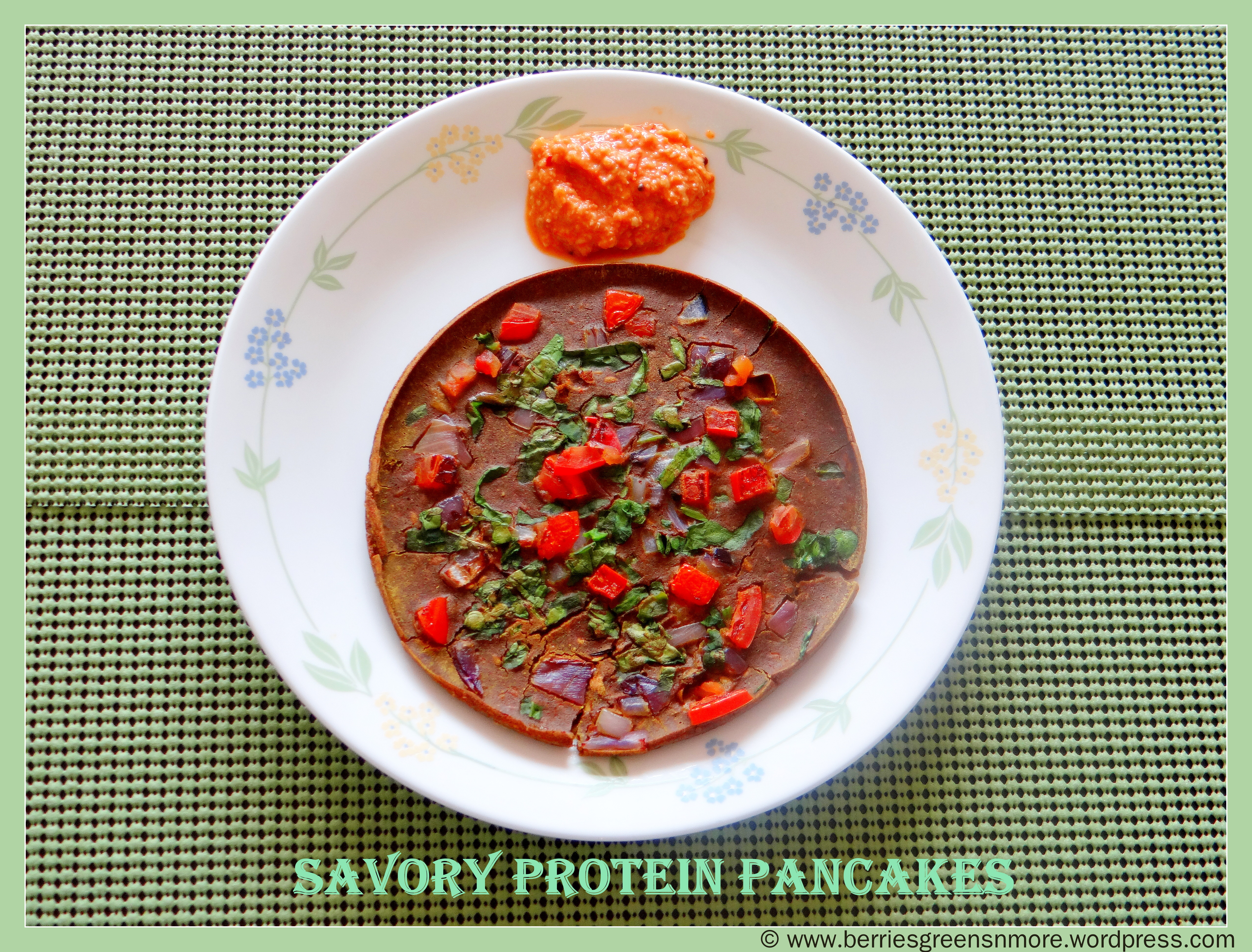 My husband loves warm and sweet homemade brunches like muffins or pancakes during the weekend. Last Sunday, for a change, I decided to make a savory protein vegan pancake. Yes, pancake and vegan, it can be done!! By the way, we are not vegans; it was just that I was out of eggs and dairy that day and we wanted to have savory pancakes, without having to go out to buy ingredients; so I came up with this recipe. These pancakes are super quick and easy to put together. They can make delicious and nourishing breakfast, brunch or even dinner. All you have to do is pour the pancake batter on the pan and top it up with some veggies and cook till done on both sides. Serve them hot with your favorite condiment/ chutney. And, guess what, they are super healthy too!!!